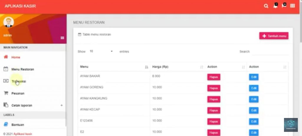 Fitur ini berfungsi untuk menginput daftar makanan dan minuman yang tersedia. Anda bisa menambahkan data tentang nama makanan atau nama minuman, harga, dan gambar atau foto makanan atau minuman tersebut.