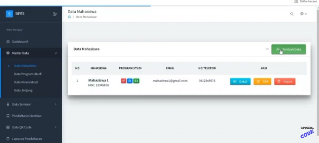 Fitur Master Data berfungsi untuk mengelola data yang berkaitan dengan mahasiswa yang mendaftar seminar online. Fitur ini dilengkapi dengan fitur turunan berupa data mahasiswa, data program studi, data konsentrasi, dan data jenjang. Fitur Data Mahasiswa berfungsi untuk menginput nama, NIM, email, dan nomor telpon mahasiswa yang daftar seminar online.