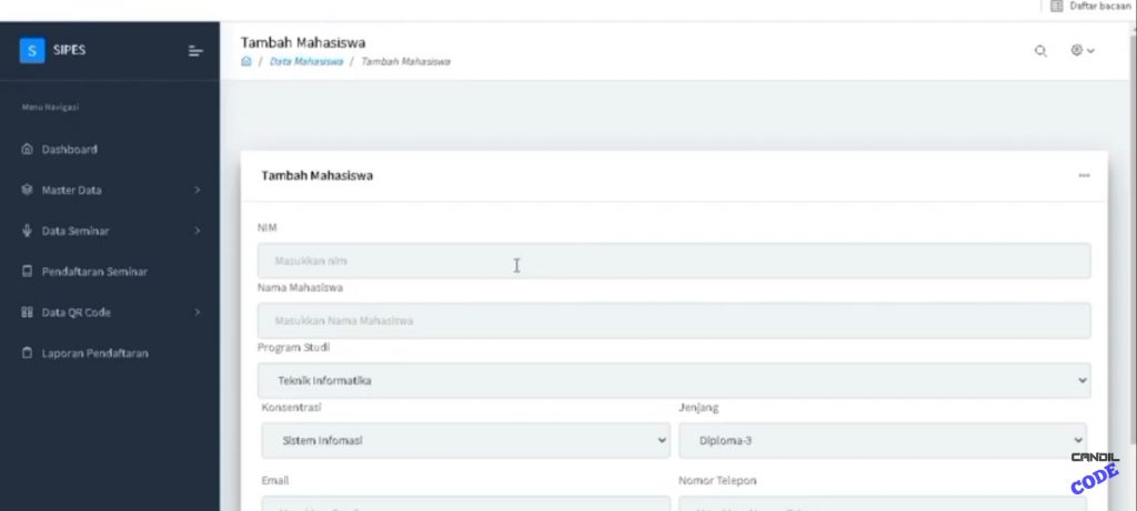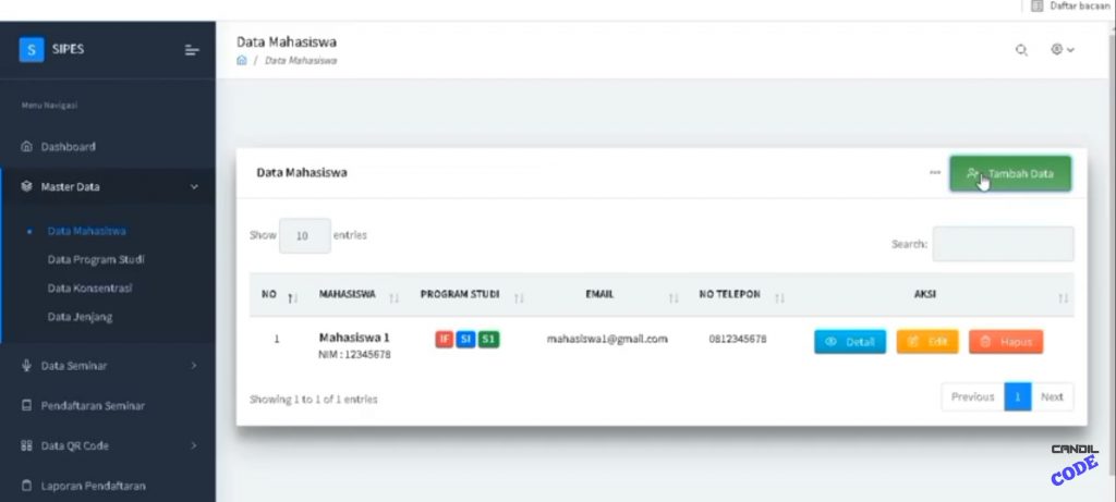 Fitur Master Data berfungsi untuk mengelola data yang berkaitan dengan mahasiswa yang mendaftar seminar online. Fitur ini dilengkapi dengan fitur turunan berupa data mahasiswa, data program studi, data konsentrasi, dan data jenjang. Fitur Data Mahasiswa berfungsi untuk menginput nama, NIM, email, dan nomor telpon mahasiswa yang daftar seminar online.