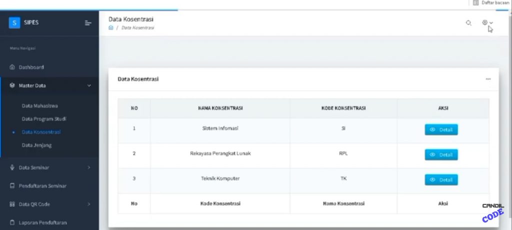 Fitur Pendaftaran Seminar berfungsi untuk mengelola data pendaftaran meliputi nama seminar, tanggal pelaksanaan, dan lampiran. Detail informasi tentang seminar dapat Anda temukan dengan menekan tombol detail pada kolom aksi.