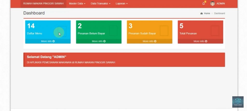 Pada bagian atas dashboard tersedia pilihan master data, data transaksi dan laporan. Sedangkan di bagian tengah dashboard tersedia menu “Daftar menu”, “Pesanan Belum Bayar”, “Pesanan Sudah Bayar” dan “Total Pesanan”.