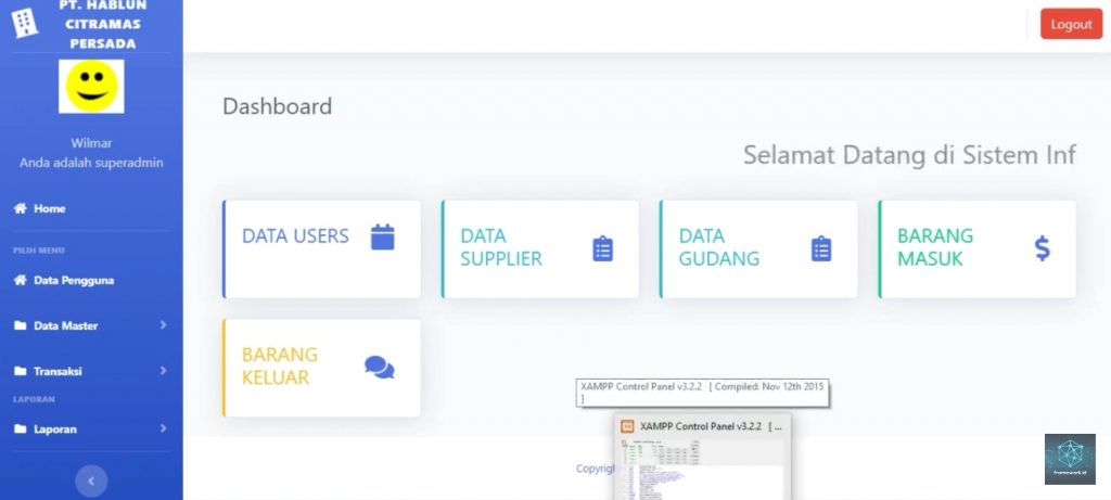 Home merupakan halaman utama yang menampilkan beberapa pilihan menu. Diantaranya yaitu, data user, data supplier, data gudang, barang masuk dan barang keluar. Semua menu tersebut bisa dibuka dan Anda akan mendapatkan banyak informasi.