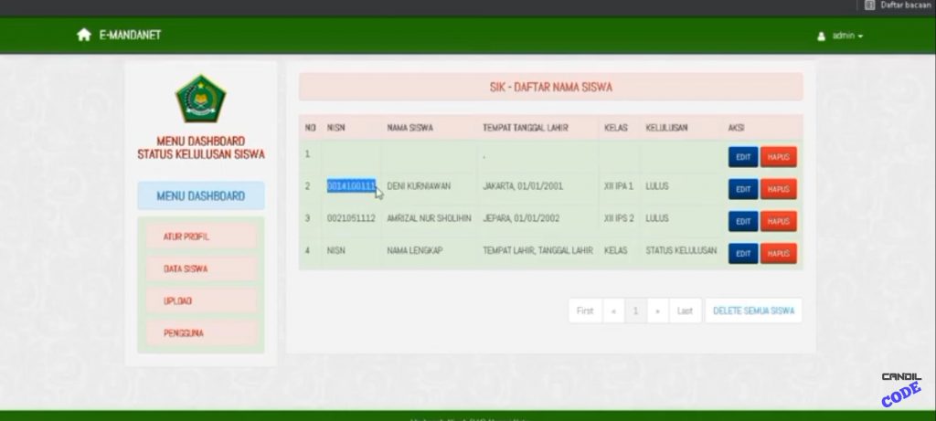 Fungsi dari fitur ini adalah untuk membuat data siswa yang akan lulus. Data siswa yang harus diinput meliputi nama lengkap, NISN, tempat tanggal lahir, kelulusan, dan kelas. Admin juga bisa mengedit, menambah, atau menghapus data tersebut sesuai kebutuhan pengumuman kelulusan.