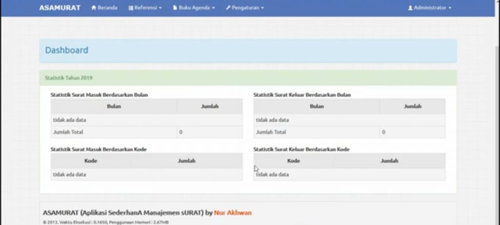 Beranda merupakan tampilan pertama yang bisa dijumpai ketika pengguna aplikasi sudah melakukan login ke dalam source code aplikasi berbasis web. Di sini pengguna bisa menemukan berbagai fitur yang terdapat dalam aplikasi. Melalui beranda ini pengguna bisa melihat statistik dari manajemen surat menyurat dari instansi atau perusahaan pengguna aplikasi.