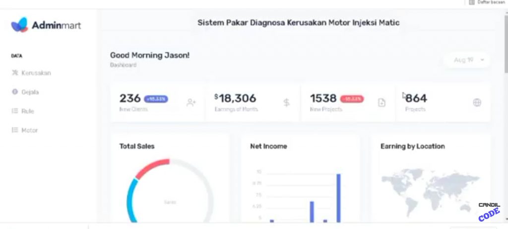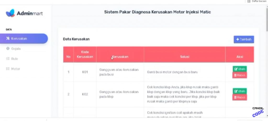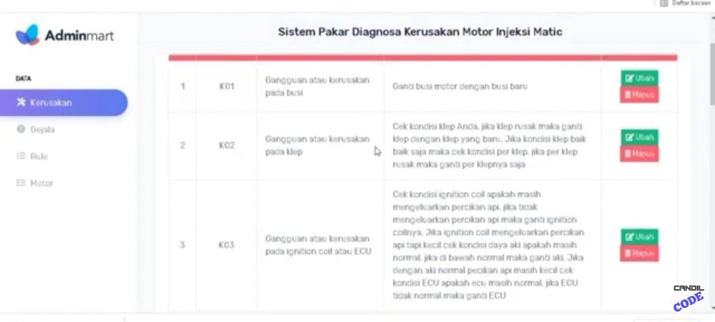 Setelah login ke dalam Source Code Sistem Pakar Diagnosa Kerusakan Motor Codeigniter ini menggunakan password yang sudah didaftarkan, pengguna langsung bisa masuk ke dalam fitur kerusakan. Dalam fitur ini, Admin bisa langsung memasukkan data kerusakan motor yang terjadi. Dari data kerusakan tersebut, nantinya akan diketahui tindakan yang harus dilakukan dilakukan.