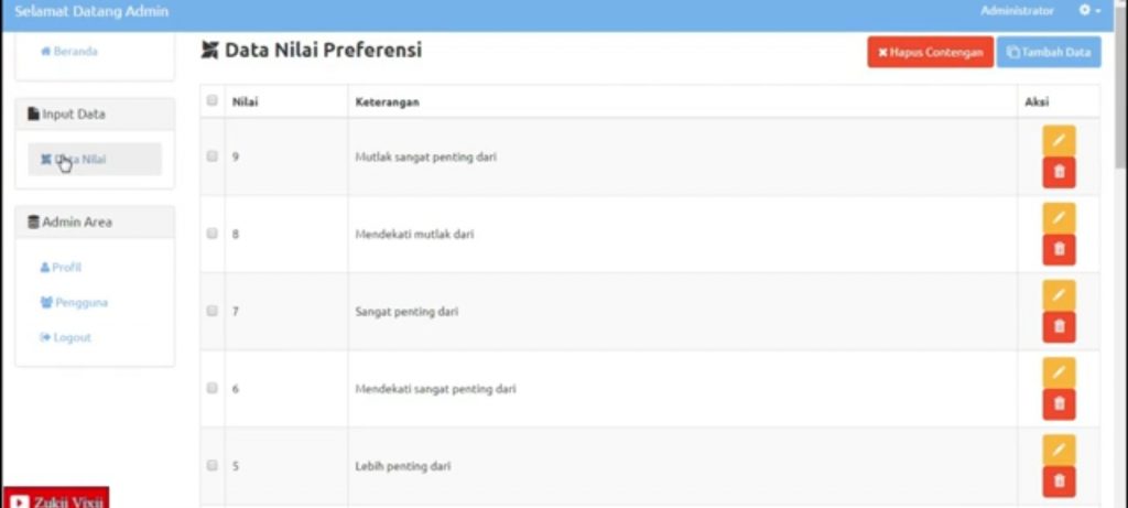 Tersedia juga opsi ‘aksi’. Opsi ini berfungsi untuk menghapus atau mengedit data nilai tersebut. selanjutnya, tersedia juga tombol “tambah data” yang ada di pojok kanan atas tabel. Melalui tombol tersebut, admin dapat menambahkan data nilai preferensi.