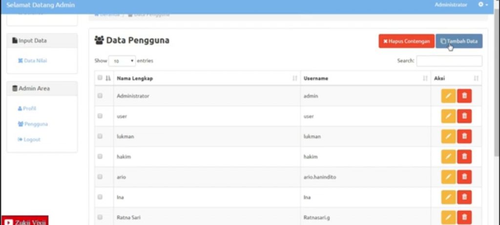 Fitur selanjutnya yaitu fitur input data. Fitur ini berisi data pengguna yang dikemas dalam bentuk tabel. Tabel tersebut memuat informasi tentang nama lengkap, username, dan opsi edit/hapus. Selain itu, terdapat juga tombol ‘tambah data’ untuk menambah data pengguna.